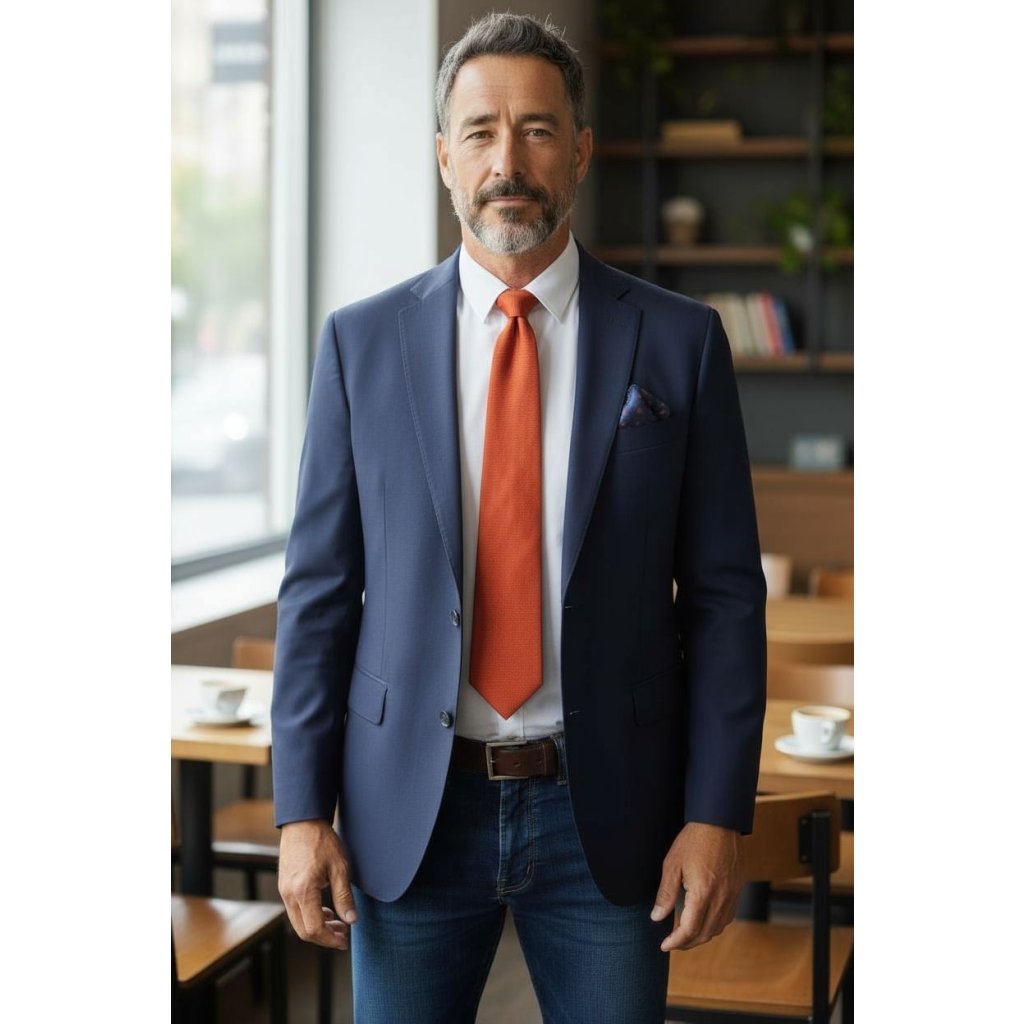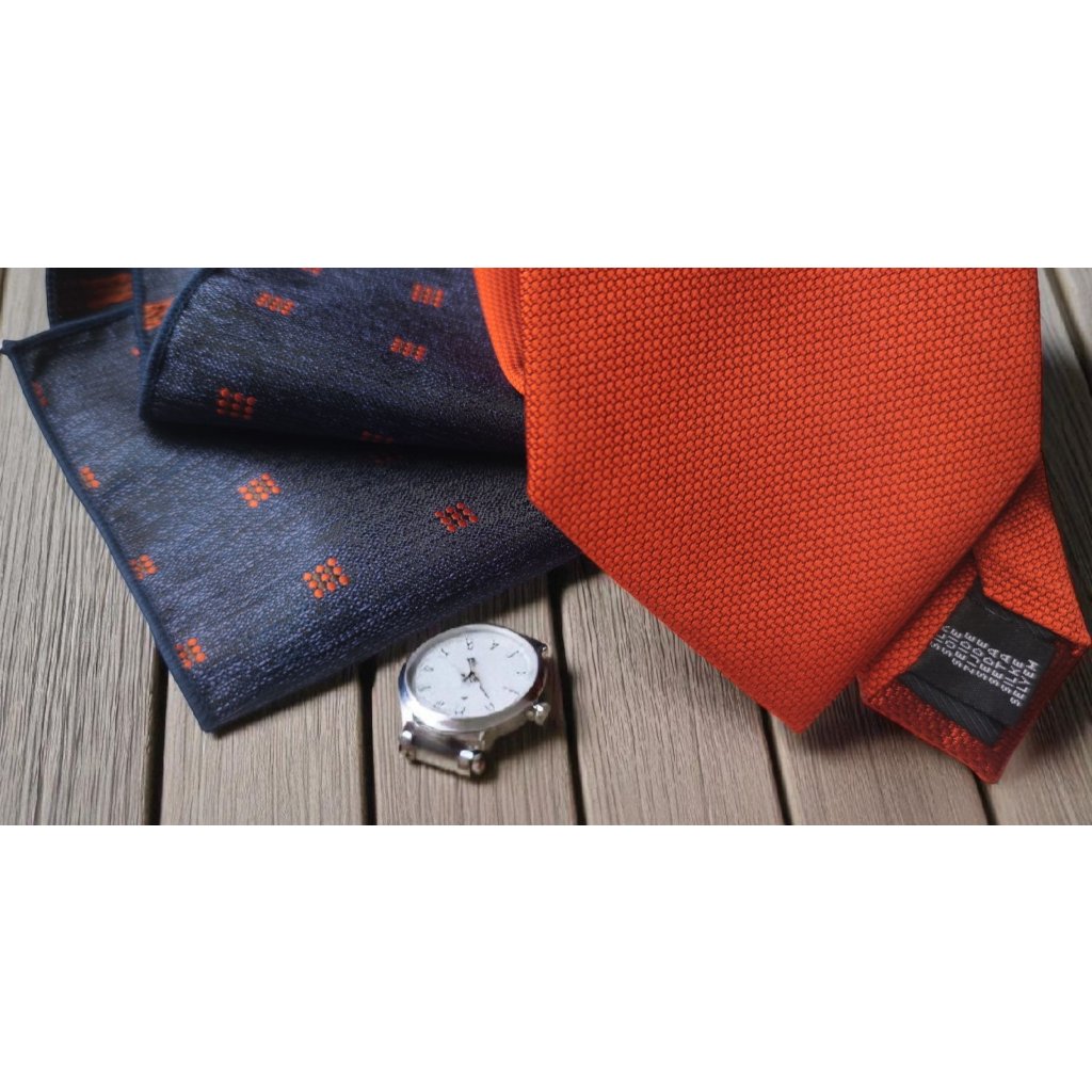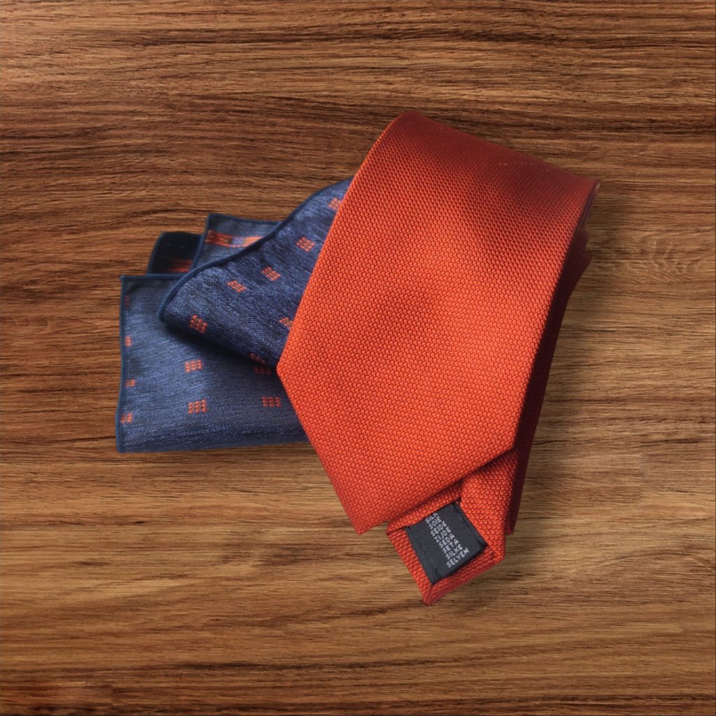 Strukturovaná kravata, jednobarevná hedvábná kravata, 100% jemné hedvábí a kapesníček tmavě modrý s oranžovými vzory